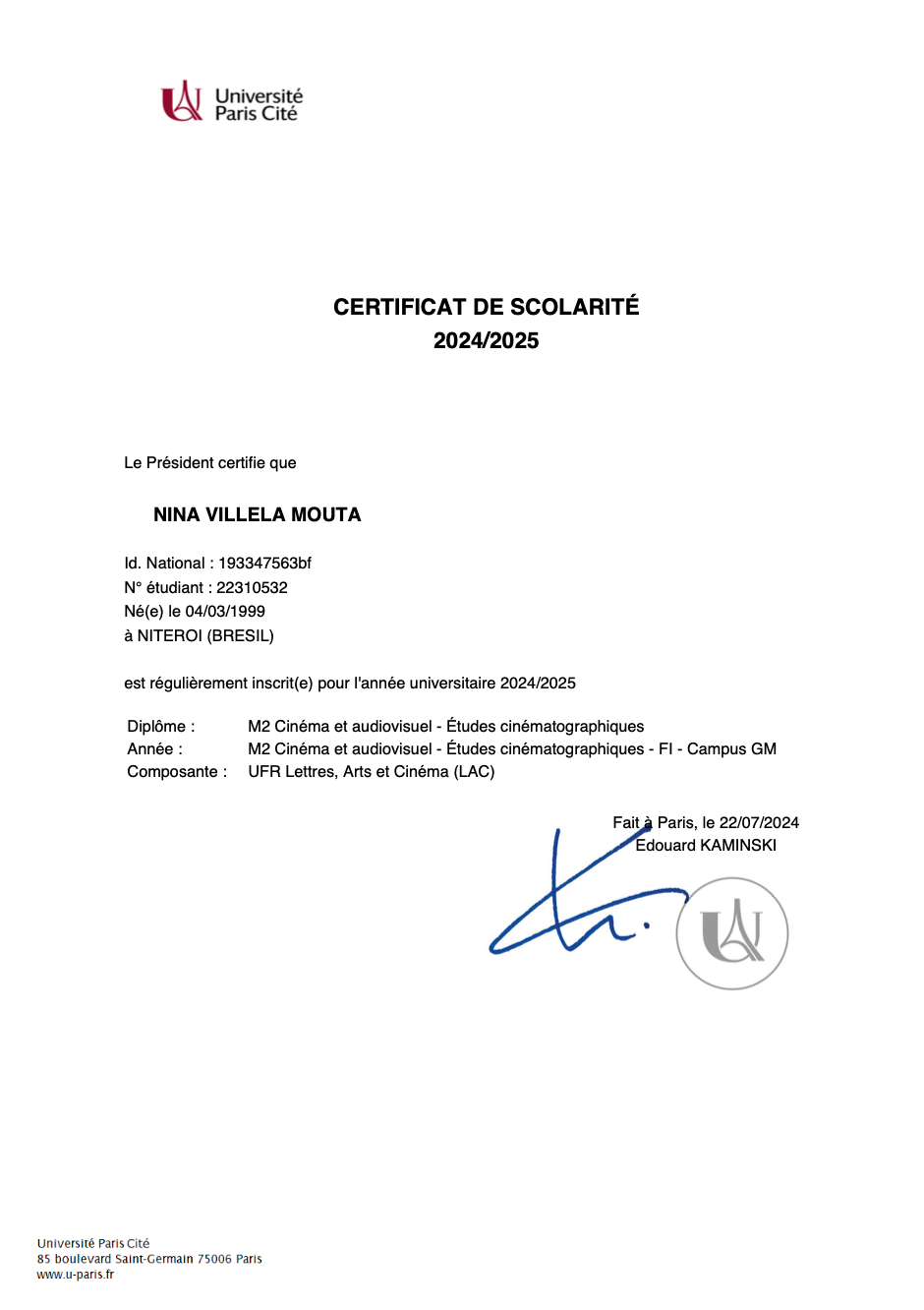 | Nina Innocenti | 06 10 46 77 93 | Nina.Innocenti@etu.univ-paris1.fr | Paris 1 | M2 Recherche Cinéma, esthétique et création | 1ER ASSISTANT.E DÉCO |