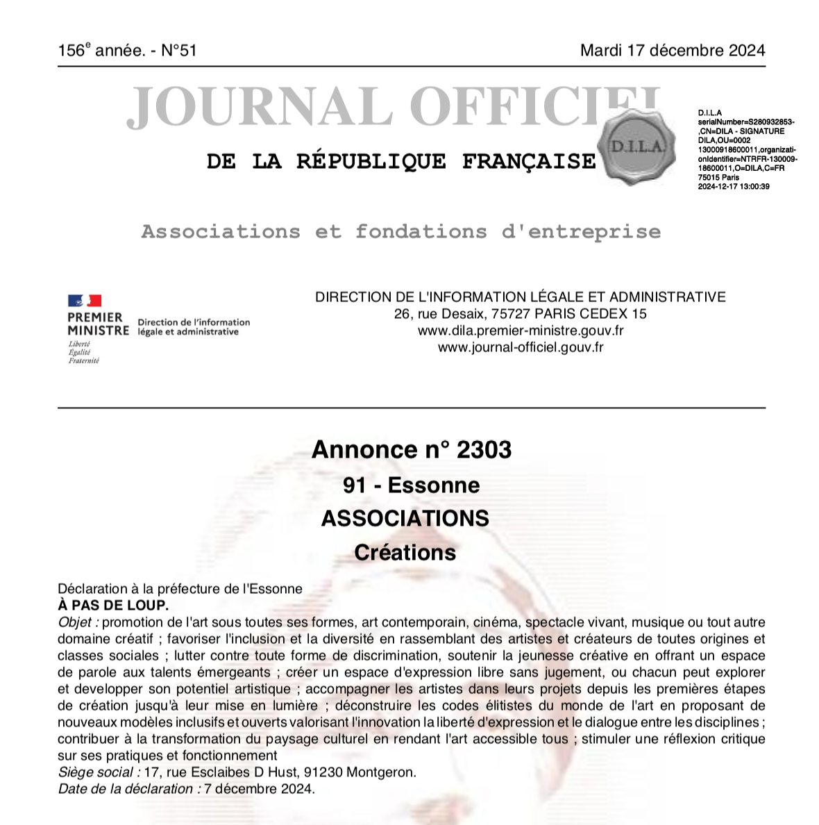 Objet de l’association : À Pas de Loup est une association qui soutient la jeune création et les pratiques artistiques pluridisciplinaires en offrant un espace d’expression inclusif et accessible, accompagnant les artistes de la création à la diffusion tout en questionnant les codes élitistes du monde de l’art.
