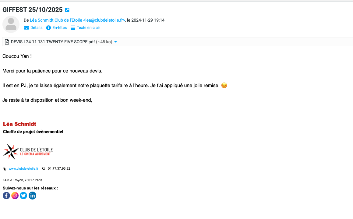 En 2021, l’association TWENTY-FIVE SCOPE a créée Le Giallo Film Festival, un festival international de courts métrages fantastiques. Le festival est fondé en 2021 par Yan Berthemy.