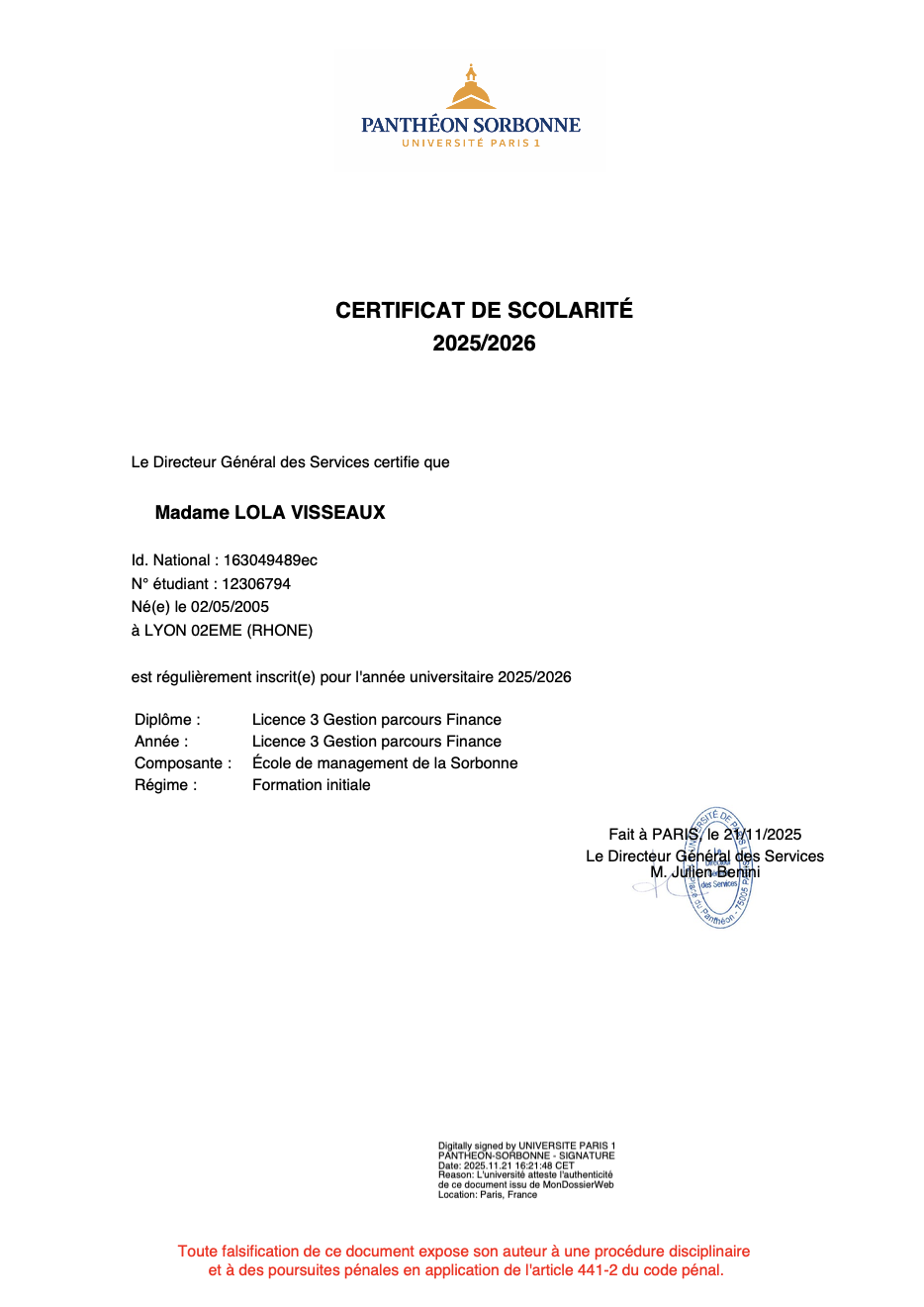 | Lola Visseaux | +33 6 42 00 51 16 | Lola.vsx@icloud.com | Paris I Panthéon Sorbonne | Gestion L3 | Trésorière de l’Association 48 pour 100 |