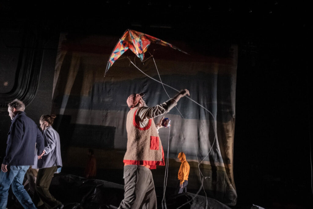 Créée au printemps 2023, cette adaptation du film d’Asghar Farhadi réunit onze comédiens d’horizons divers (irakien, iranien, belge, néerlandais, afghan) pour une performance sans metteur en scène, fidèle à la démarche collaborative de tg STAN. La scénographie, réduite à l’essentiel — une simple bâche suffit à figurer la mer déchaînée — met en lumière le processus de création. Et c’est un jeu de miroirs troublant qui s’installe entre ce groupe d’amis qui tente de rester uni dans l’adversité et les comédiens, issus de quatre compagnies différentes, embarqués ensemble dans cette aventure théâtrale.