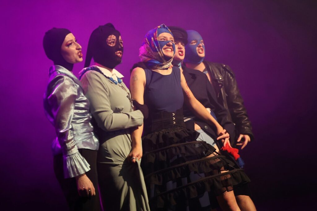 Dans ce zapping burlesque – à coup de 49.3, cagoules et talons – iels bercent des flingues, lipsync des tirades de Queen Schiappa, dégustent à genoux l’hostie, la langue tendue vers des mains pieuses de cuir noir. Au fil du temps, les personnages prennent en liberté, laissent échapper des indices sur leurs névroses et sinistres dysfonctionnements. On les voit évoluer jusqu’aux scènes collectives orgiaques où chaque personnage semble dévoiler sans complexe leurs vrais visages : des sales gueules de fascistes.