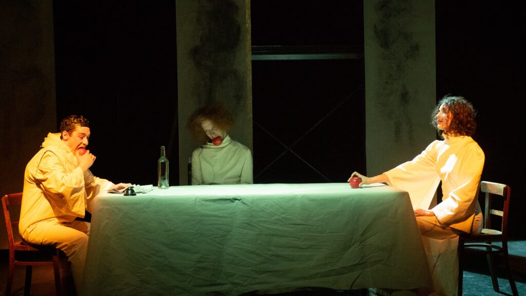 Il était une fois un roi et une reine vraiment très méchants, et un bouffon persécuté. Enfermés malgré eux dans un palais, ils doivent cohabiter. Trois clowns grotesques et cruels, aux corps tordus et dégingandés, tout droit sortis de chez Beckett, Kantor ou même Tarantino. Pathétiquement drôles, ces trois antihéros névrosés se disputent le pouvoir et ça déborde de toutes parts. D’une valse monstrueuse à un suicide, en passant par des courses-poursuites et des résurrections, le trio sarcastique ne recule devant rien pour venir explorer les rouages de la violence et de son renversement. Comment échapper au réel qui enferme et aux stéréotypes sinon par la jouissance du jeu ? Loin de tout naturalisme, voici une farce sur le pouvoir et la possibilité d’en abuser, une anatomie joyeuse et clownesque de la violence et de la domination. Un conte désossé qui met aux prises les figures de notre enfance dans une quête effrénée de liberté, un combat désespéré contre l’ennui !