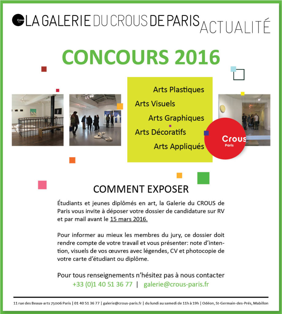 [x_button shape=”square” size=”small” float=”none” href=”http://www.culture-crous.paris/wp-content/uploads/2013/09/Dossier-de-candidature-crous20161.pdf” info=”none” info_place=”top” info_trigger=”hover”]Télécharger les modalités de candidature[/x_button]